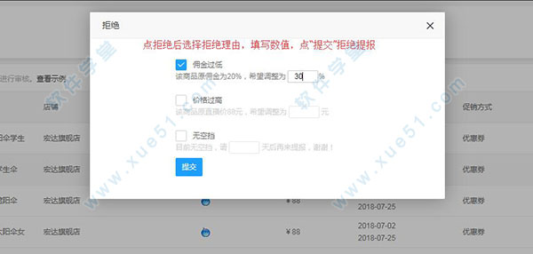 6、点“拒绝”后选择拒绝理解,填写相对于期望数据,点“提交”完成拒绝提报。点击“拒绝”后会立马返回到商家端,商家即知道您的审核状态。