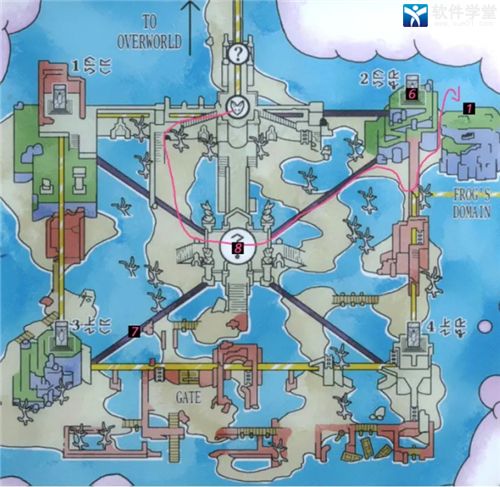 1、通过【1】的后方进入青蛙的领地,然后跟随图片中的粉色线条走,并自行寻路通过中心到达右上方,再在桥下右方找到通往山后方的一条路
