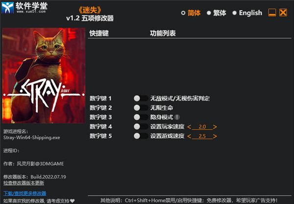 迷失Stray修改器风灵月影版辅助工具则为玩家提供了多种能力的修改功能,即可开启无限生命或者无敌模式带着猎头蟹一起冒险,又可以开启隐身模式,直接让猎头蟹看不到猫咪,此外,玩家也可以自行调节游戏的速度来跳过过度场景,感兴趣的朋友可以来本站获取该修改器的应用资源。