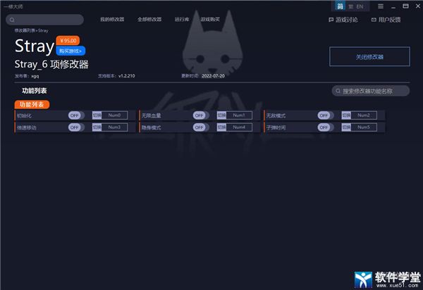 迷失Stray修改器一修大师版辅助工具是一款帮助玩家能够安心探索解密的实用工具,开启对应的功能之后,玩家就可以在游戏中体验到修改过后的功能效果,不仅能够用于探索与收集,而且修改让玩家在跑图的路上更加的迅速,不用每次都慢慢吞吞的移动。当然,途中也会出现一些阻挡玩家探索的敌人"猎头蟹机器人",虽然处理起来比较简单,但是招架不住数量多,而且附着在身上也特别麻烦,所以小编也推荐大家下载这款迷失Stray修改器。别看功能不多,但是对付猎头蟹的效果还是非常不错的,开启之后就不用担心老是被猎头蟹折磨死,而且还可以用来解锁成就,甚至玩家可以开启子弹时间,和猎头蟹来共同演绎一场黑客帝国名场面。感兴趣的朋友可以来本站下载这款修改器的应用资源。