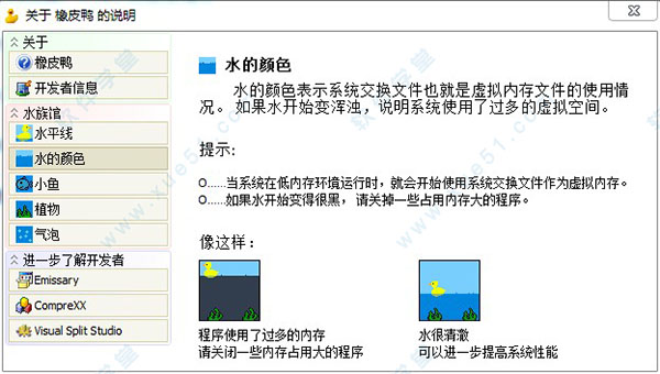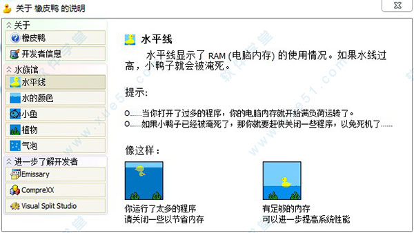 水平线显示了RAM(电脑内存)的使用情况,如果水线过高,小鸭子就会被淹死