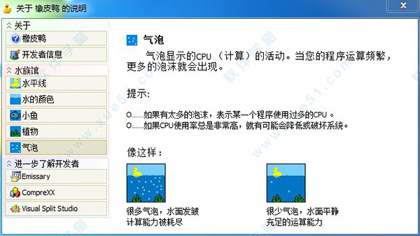 Rubber Ducky(橡皮鸭)是一款来自国外的电脑检测软件,操作简单,使用方便,而且占用内存资源小,实用高效。软件支持一键进行电脑系统检测,能够及时查看设备信息,同时可以实时监测本地计算机中各类设备的运行情况,随时监测系统状态。软件界面新颖、独特,它以鱼缸的形式出现在系统托盘上,电脑的情况被反映在鱼缸里,其中鱼类代表网络情况,植物代表硬盘,水泡代表CPU使用率,水的颜色和水位代表内存情况。本站为用户提供