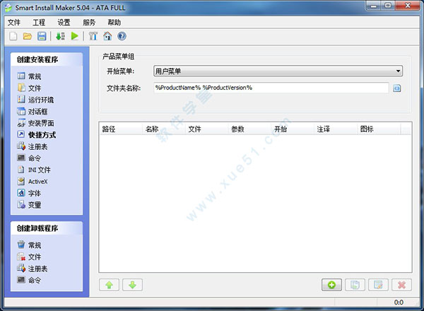 选择“快捷方式”路径,选择“开始”和“程序组”时,“对话框”选项中的“产品菜单组”中的路径会起作用,如果不想在“开始”和“程序”中创建文件夹,可以在“对话框”选项中把“产品菜单组”中的路径删除