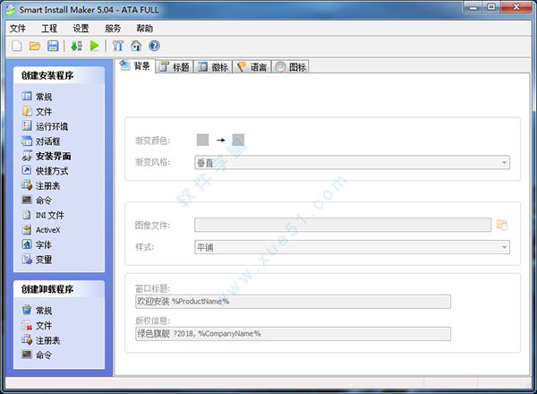 支持设置安装界面的背景、标题、徽标、语言种类以及图标等信息,如下图所示: