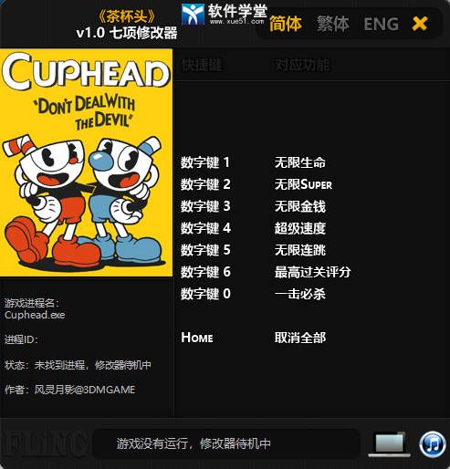 茶杯头七项修改器是由风灵月影制作的一款游戏辅助工具,改修改器会自动判定玩家是否打开游戏而开放功能权限,当检索到运行的游戏程序,玩家就可以通过其简单的快捷热键来激活对应的功能,之后便可以在游戏当中获得对应的能力,其中包括了无限生命、无限Super、无限金钱、无限连跳等,让玩家在面对各种boss时都能够做到轻松通关。其次对于玩家最重要的便是本场战斗的评分,想要打出全boss满S的存档并不简单,但是小编推荐的这款