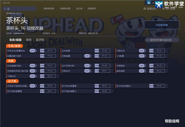 茶杯头修改器是一款能够帮助玩家提升游玩体验,改善游戏难度的辅助工具,该修改器有着十多项看使用的技能,玩家可以按照自己的需求去开启对应的修改功能来优化自己的游玩体验,不仅有着多项无限制的功能可以使用,该可以指定修改子弹的大小、伤害、密度或者是大招的充能效果,当然直接全部开启无疑是玩起来最爽的选择。不过有些功能需要玩家做到前置条件才能够真正触发,所以在使用之前,大家最好还是查看一下修改器的使用说明,避免功能无法开启所产生的窘境。本次小编也为大家带来了这款