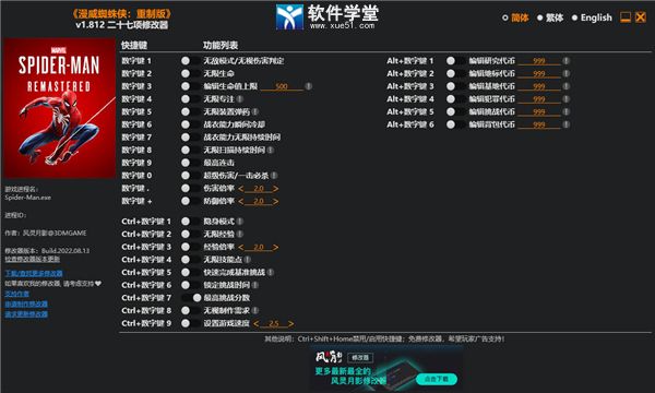 漫威蜘蛛侠重制版修改器是一款十分便捷的游戏辅助工具,使用该修改器无需安装任何的应用软件,打开即可使用,玩家只需要通过快捷热键便可以在游戏中随意的开关功能,部分功能需要玩家优先编辑好获取的数值,让玩家在使用时更加自由。其次,除了编辑功能以外,该修改器该提供无限生命、无限专注、无限弹药等战斗功能,还可以选择极为暴力的超级伤害以及超级防御,想要快速升级的朋友还可以调节好经验获取倍率后开启该项功能,之后玩家就可以获得大量的经验,当然用于加点的技能点数也是必不可少的。本次小编也为大家带来了这款