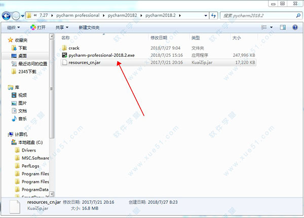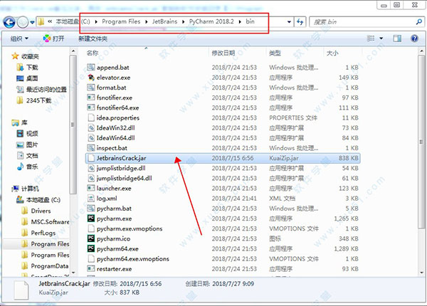 2、回到软件安装包,打开“crack”文件夹,将“JetbrainsCrack.jar”复制到pycharm 2018.2安装路径中C:\Program Files\JetBrains\PyCharm 2018.2\bin