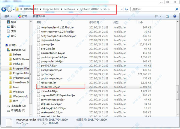 1、通过上图我们可以看到软件pycharm 2018.2破解版是英文版界面,接下来要把软件界面汉化为中文版界面,首先打开软件安装路径中的“lib”文件夹,将“resources_en.jar”英文版文件删除,再将软件安装包汉化补丁“resources_cn.jar”复制进去就可以了,默认安装路径为C:\Program Files\JetBrains\PyCharm 2018.2\lib