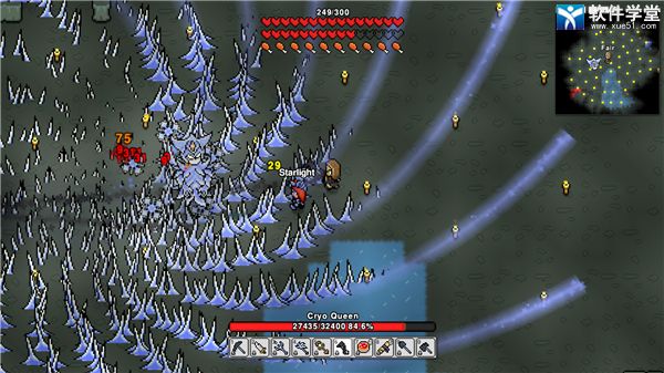 8、冰雪女王:最难打的boss之一,移动速度快,弹幕超级密集,近身战基本没戏,护甲叠起来一下也是三十多的血,推荐召唤物加上远程不断走位打,弹幕很麻烦,推荐拉开距离,差不多屏幕边上能看见boss这个距离就可以,不要贪杯,基本上这个boss技能中一下就代表后面一串也要吃上了。