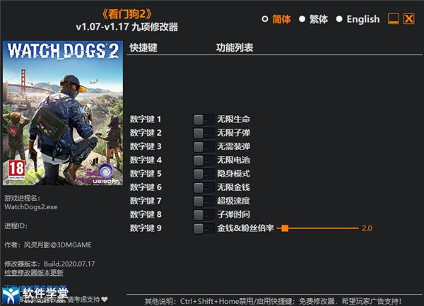 看门狗2修改器使用风灵月影所制作的多功能游戏辅助工具,对于风灵月影的修改器相信大家都不会陌生,使用体验以及功能效果都是有目共睹的,而该修改器则可以为玩家提供无限生命、无限子弹、无限电池、无限金钱等功能,帮助玩家轻松消灭隐藏在灯红酒绿的世界当中敌人。不过这些功能并非是完全无敌的,使用前大家还得查看一些功能的使用说明,就像无限生命一样,超过生命上限的伤害是无法抵消的,因此即便是有了这么多的修改功能可以免费使用,玩家也需要根据当前的环境去使用,当然高玩就另当别论了。本次小编也为大家带来了这款