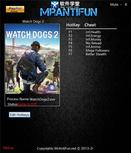 看门狗2修改器是一款十分精致的游戏辅助工具,这款修改器虽然功能不多,但是对于玩家日常游玩的过程中都非常实用,并且不会像其他类型的修改器一样在给予玩家功能的同时还与带有一定的使用限制,玩家只需要开启功能便会在游戏中获取对应的效果,完全不用担心功能失效、无法使用等问题。而且该修改器可以使用快捷热键激活对应的功能,玩家在游戏中也不必经常切换游戏界面,甚至如果这些热键都被其他的应用所占据,玩家还可以点击Edit HotKeys修改功能按键。本次小编也为大家带来了这款