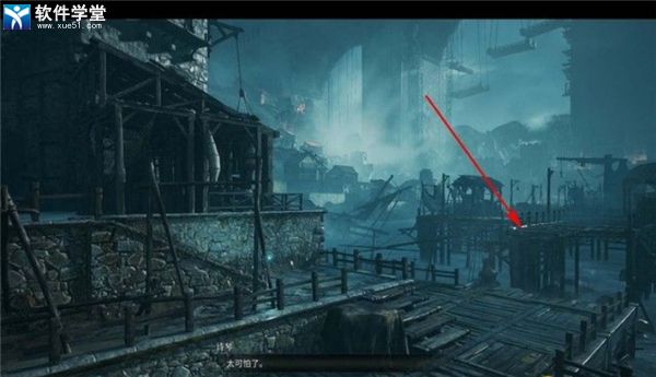 来到码头,河中有一艘沉船,如下图箭头所指,踩着它过去。