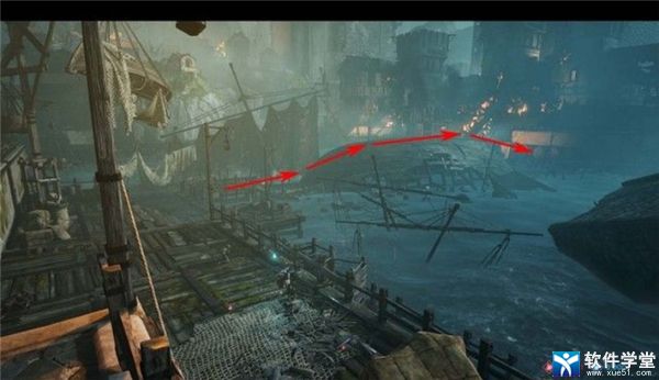回到岸上房子这里,如下图箭头所指,对面可以使用二段跳,跳过去。