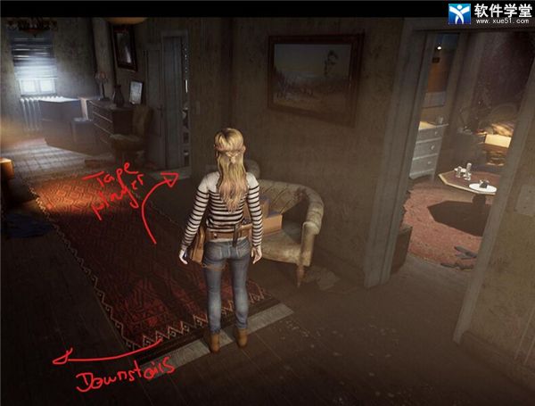 当您在Contact的这条黑暗走廊中醒来时,您只有一条路可走:前进。在隧道尽头拉响警报,它应该会开始一段电影,你最终会在床上醒来。伊莉丝现在可以自由地在伊莉丝的房子里漫游。您的第一个目标是找到当前楼层第二个房间内的磁带播放器。