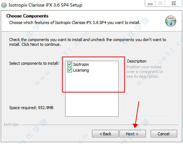 3、选择安装组件,点击“Next”进行下一步,根据安装向导提示开始安装,直至软件安装完成