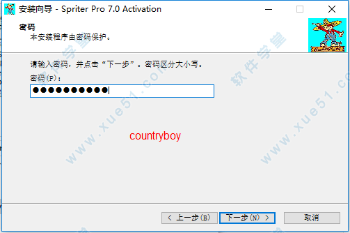 3、输入密码:countryboy,点击下一步自动安装补丁即可。