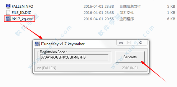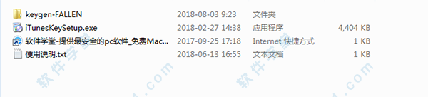 1、在本站下载并解压,得到“iTunesKeySetup.exe”安装文件和“keygen-FALLEN”破解文件。