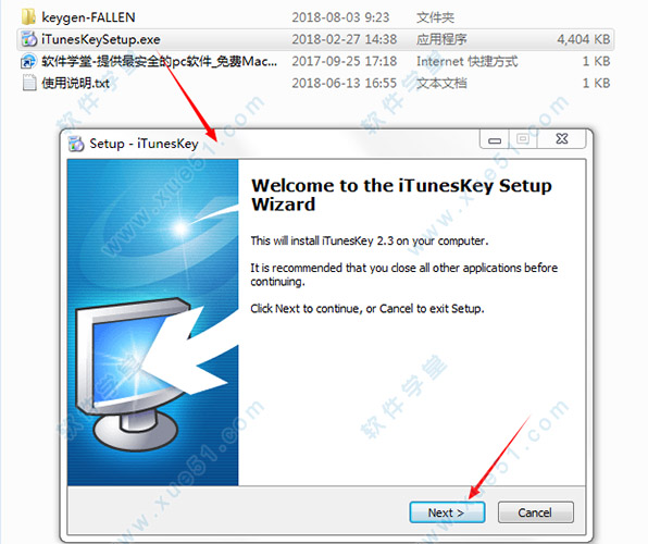 2、双击“iTunesKeySetup.exe”运行,在安装向导界面点击“next”。