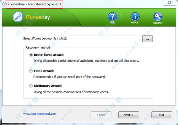 iTunesKey是由Top Password官方出品的一款功能强大的、专业级Tunes密码恢复工具。软件支持暴力攻击,掩码攻击和字典攻击。适用于所有版本的iTunes,iPhone,iPod和iPad。软件可以对已经设置密码的文件破解,让您重新将iTunes上的文件恢复到没有添加密码之前。相信很多用户的数据都是保存在iTunes上的,如果您在保存数据的时候添加了密码,长期不输入密码以后就可能会忘记,导致无法访问自己的手机备份数据,这时候就可以利用的这款iTunes密码恢复工具找回软件帮助您分析密码,通过分析以后您就可以知道以前设置的密码了!本次小编为大家带来的是