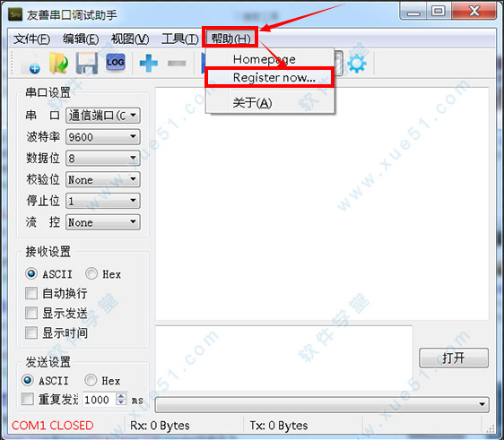 3、进入软件界面后点击“帮助”,再点击“register now”进入设置。