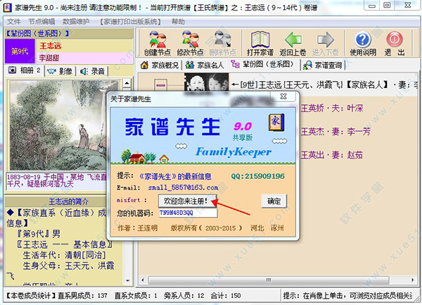 1、在桌面双击运行软件,进入软件之后点击“帮助-关于家谱先生”,弹出页面点击“欢迎您来注册!”,弹出注册页面