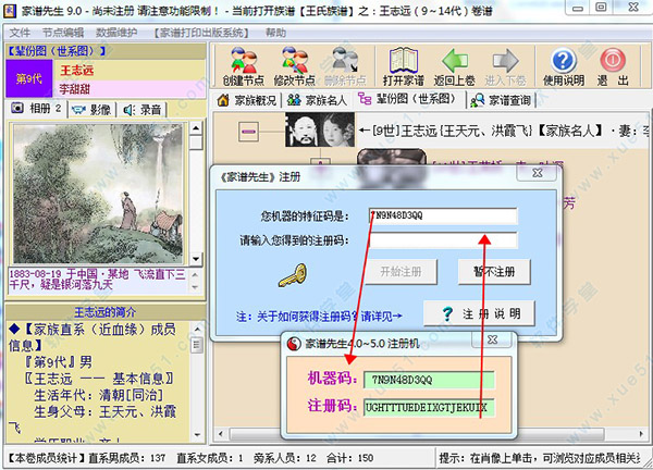 2、回到软件安装包,双击打开“家谱先生注册机.exe”注册机,将注册页面特征码复制到注册机的机器码框中,自动生成注册码,然后将生成的注册码录入到软件“请输入您得到的注册码”方框中(不能直接复制粘贴)