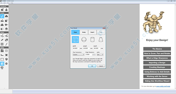 Cubify Sculpt 2015是由cubify机构最新出品, 这是一款强大的虚拟油泥(virtual clay)造型、建模3D创作工具,毫不夸张的说,有了他,任何人都能够使用一般的计算机与鼠标,轻松的制作出各种三维打印模型。应用虚拟黏土的概念,用户透过十分简易的工具,可以“捏”出各种不同的造型,例如细致的人脸、艺术品、装饰品等3D对象。不仅具有速度快、质量高、兼容性好等特点,而且还提供了浮雕图案、纹理功能、混搭功能等功能,可以帮助用户轻轻松松的制作出各种三维打印模型,另外还有一大特色就是简易使用,兼容非常性极强,能够立即编辑目前3D打印机最普遍支持的STL、OBJ、PLY、CLY等文件进行实时编辑和输出,因此您可以将现有的作品加以改良,制作出更具创意的设计作品。此外还能够贴上3D立体花纹增加物品的质感,或是将3D对象上色后,透过特定的服务打印出彩色的3D对象。Cubify Sculpt 2015为完美破解版,提供注册机,另配有详细的安装破解教程,欢迎有需要的朋友免费下载体验。