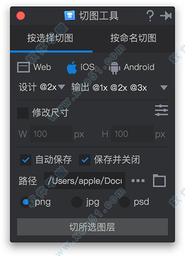 4、Retina双尺寸输出当采用2x或3x设计时,在想要输出的图层后面添加@2x或@3x,如demo@2x.png。这样就可以在输出原尺寸切片的同时,再输出一张缩小相应比例的小尺寸图。