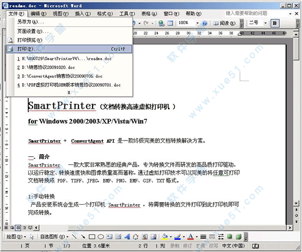 1、手动转换产品安装后系统会生成一个打印机 "SmartPrinter",将需要转换的文件打印到此打印机即可完成转换。