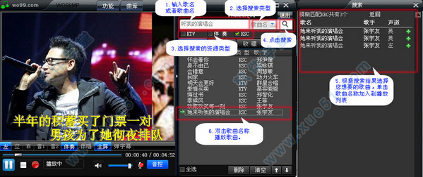 1、打开软件,10万首优质带歌词立体声原版伴奏,9万首高品质KSC伴奏以及歌词,大家可以按照图上标示步骤操作。
