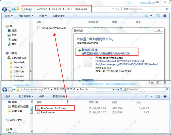1、软件安装完成后,回到软件安装包中打开“Patched”文件夹将破解补丁“FilmConvertPro2.1.aex”复制到软件安装目录下(一般默认路径为:C:\Program Files\Adobe\Common\Plug-ins\7.0\MediaCore),并覆盖替换原文件,选择“复制和替换”即可