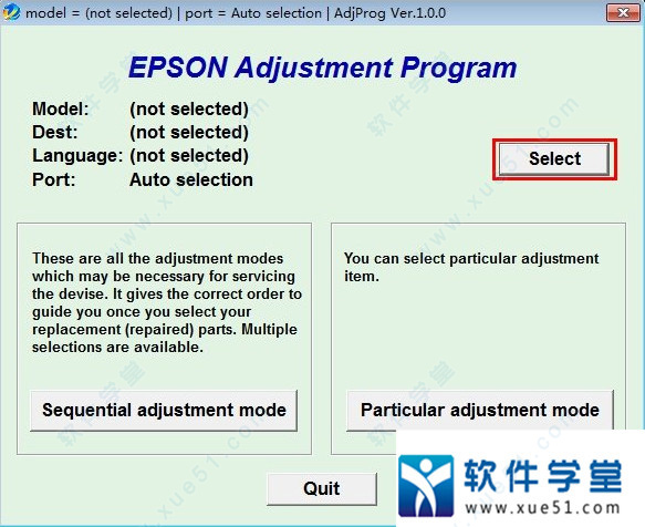 1. 运行Epson Adjprog工具主界面,点击Select按钮。
