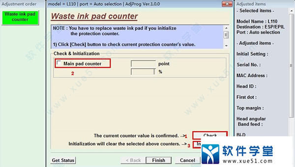 点击Check按钮,获取当前废墨计数器的数值,然后选中计数器前面的选择框,点击Initialization按钮完成初始化。