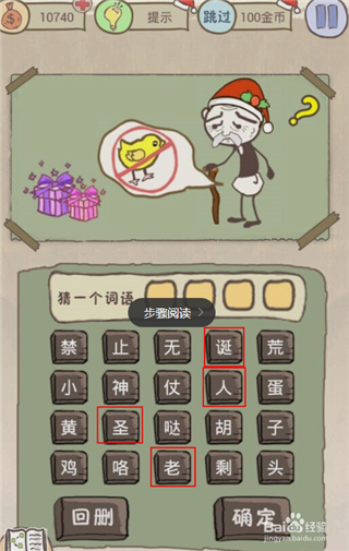 1.这些关卡是难不倒我们的坑爹玩家的,联想到这次的主题,再认真观察图中的所有文字,我们不难想到“圣诞老人”这个词语,依次输入,点击确定,成功通关!