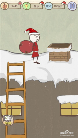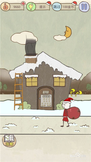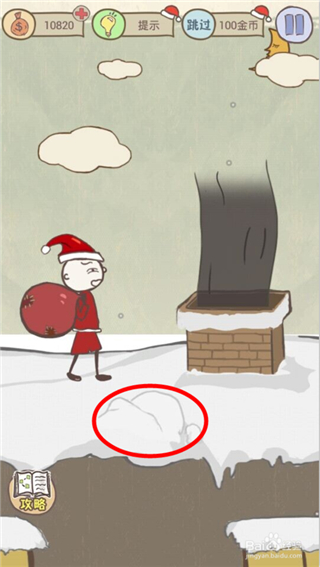 1.对比这关跟前面的送礼物关卡,发现在烟囱处有点不同,那就是这关的烟囱竟然在冒烟,想必这肯定是一个坑点吧!得围绕着这点去想方法!