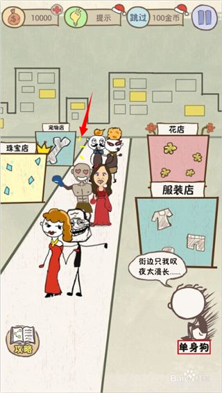 2.点击宠物店,发现一只狗头冒出来,或许它也是一只“单身狗”,同是天涯沦落人,相逢何必曾相识?再次点击这个狗头,小狗会跑到坑爹男身边。