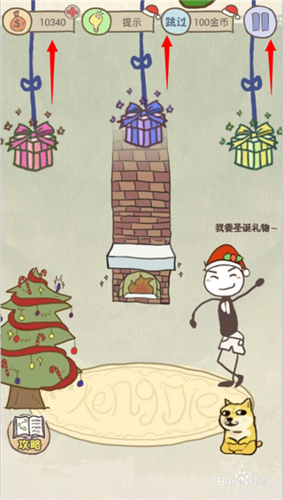 2.拖动地上的礼物至烟囱,再点击坑爹男,坑爹男这样就能轻松地钻进烟囱里面啦!