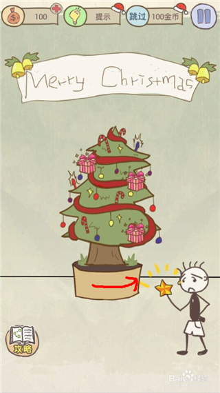 3.拖动竹蜻蜓至坑爹男身上,就能让坑爹男戴上竹蜻蜓飞上去,这样就能给圣诞树挂上星星啦!