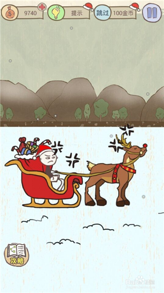 2.连续摇动手机3次,会掉落3件物品,第3件物品是个系着胡萝卜的拐杖,点击该拐杖,坑爹男就可以让驯鹿带着雪橇开始奔跑啦。
