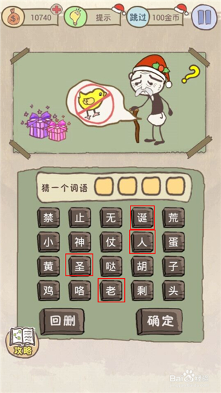 3.小朋友们可能会觉得这关难一点,但是一联想到没有小鸡鸡跟老人,玩家们还是很容易想出“剩蛋老人”这个词的,然后根据这个谐音,我们就找出了“圣诞老人”这个词语。