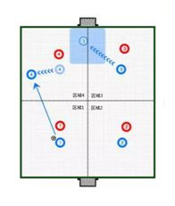 在2-2阵型里,也可以是“田”字划分区域,2-2阵型中,左边前场球员(蓝4)拉开进攻宽度,不仅可以接球,同样也可以把防守队员(红4)拉扯出原来的防守位置;
