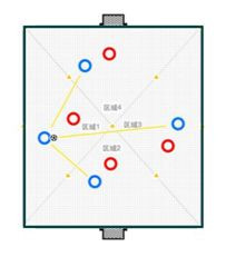 其中1-2-1阵型中,要注意的点就是四名球员由对角线划分为四个区域,例如在区域1当中的蓝色球员持球的话,蓝色进攻方的其他三名球员最好就是分别在区域2、3和4当中移动、拉扯空挡、试图接球。
