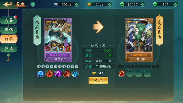 传承灵兽可以将经验、星级、境界、技能传承到受益灵兽上,如果孵化出评分更高的灵兽,可以直接使用传承功能节约养成的时间。