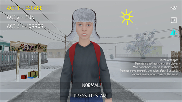 4、通过巧妙地规避父母的监视,解决各种谜题,体验一场充满智慧与勇气的冒险之旅。1、在软件学堂下载安装并打开游戏,选择游戏难度后点击【PRESS TO START】开始游戏。