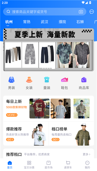 网商园分销商app是一款专门为商家打造的进货软件,这里为商家带来了不同市场的货物,如杭州市场,常熟市场,石狮市场,织里市场等,用户可以根据自己的需求前往不同的市场进货。软件为用户带来了不同的商品,男装,女装,童装,运动鞋,包包,服饰配饰等,每一个版块中都有着大量的商品,用户可以根据自己的需求选择购买,将需要的商品加入进货车,等到后续与其他的商品一起结算。