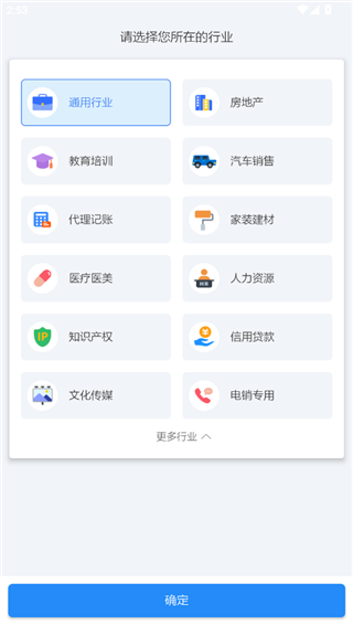 3、选择你所在的行业,如通用行业,房地产,教育培训等,随后点击确定